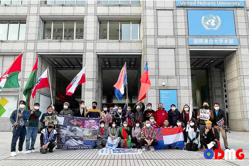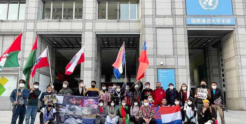 Nyan Hein — Members of Myanmar ethnic minorities staged a demonstration in front of the United Nations office in Tokyo, Japan, on November 26, demanding that Myanmar authorities release students arrested for participating in protests against conflict and human rights violations in Arakan State.