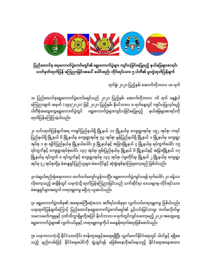 The statement came from the Kachin State People’s Party, Kayah State Democratic Party, the Karen National Democratic Party, the Chin National League for Democracy and the Mon Unity Party.