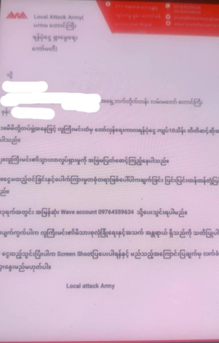 The blackmail messages, sent via messaging apps and letters, first started appearing on 20 November. They claim to be from the Local Attack Army (LAM), a faction of the Taunggyi People's Defence Force (PDF), according to a source in Taunggyi City.