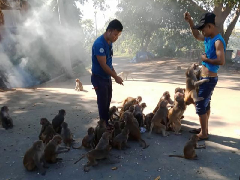 “I think there are at least a thousand monkeys [in the vicinity of Kyauktaw Mountain Pagoda],” said U Kyaw Kyaw, secretary of the pagoda’s board of trustees. “Donors who came on pilgrimages urged us to build a large orchard on this mountain so that there would be no shortage of food and water for the monkeys, and we plan to plant more fruit trees next year.”