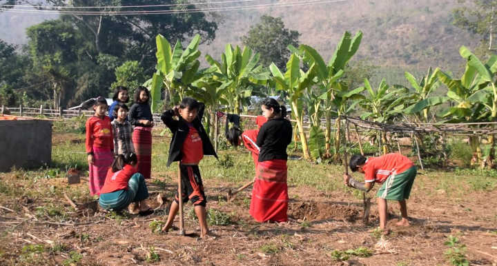 Maw Oo Myar — When seeing a group of school-age children cleaning the compound; some holding hoe while some holding sword, they are actually cultivating crop themselves happily and actively with the expectation to consume fresh vegetable.