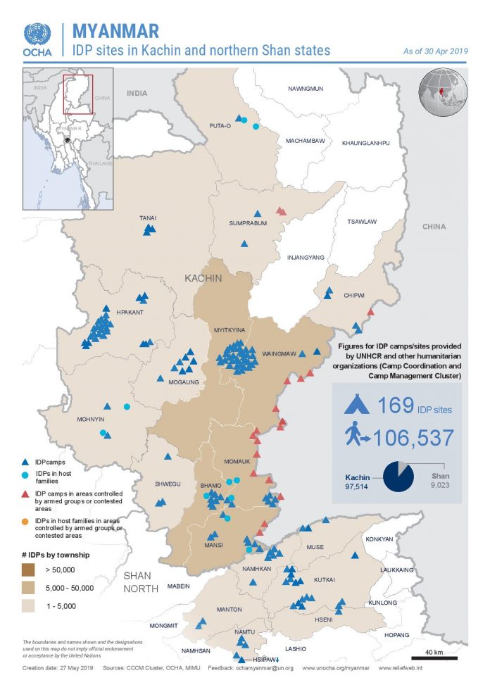 According to Myanmar Ministry of Information in December 2019, there are more than 140 displaced persons camps, with a total population of more than 160,000 in 15 townships in four states. The ministry said that it is important to determine the plan and policy to close the displaced persons camps, and work procedures need to be setup so that the closing of the camps can be conducted based upon international norms, and international cooperation as required.