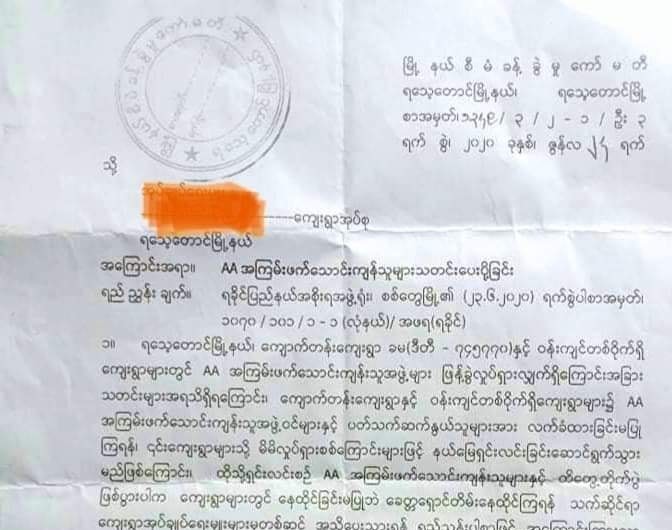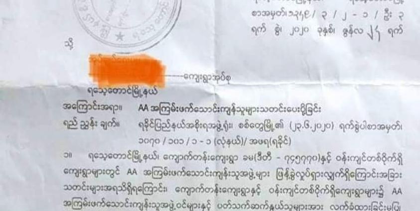 The order issued by the border affairs minister stated that the military had received information that Arakan Army troops had been deployed in Kyauktan village tract and warned locals against accommodating them.