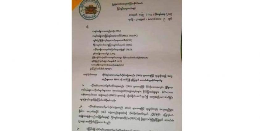 Lt-Gen Khin Zaw Oo (Rtd), a Secretary of the Peace Commission, signed the letter which informed all 10 NCA-EAO signatory members they must first request approval from the Peace Commission before attempting to contact the UN, foreign embassies or INGO’s.