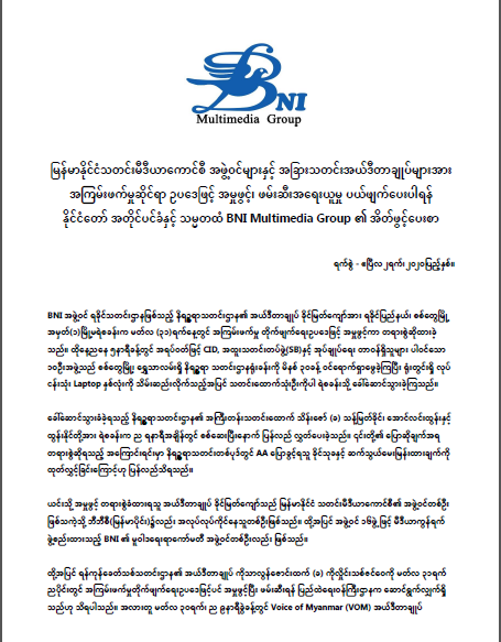 Burma News International (BNI) sent an open letter to the president and state counselor to withdraw all charges against several editors accused of violating the Terrorism Act.