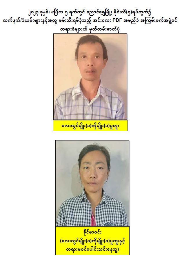 On April 5, Lay Lwin Myo (aka) Ko Myo and his wife Khine Zar Win were apprehended by the Military Council for possessing explosives and ammunition. The couple, who reside in Mong Li 5 Ward of Nyaung Shwe Township, were accused by the Military Council of being the masterminds behind the Inle Floating Thingyan bombing.