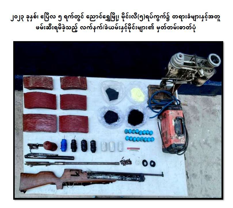 The Military Council troops seized several items, including one air gun, six handmade claymore mines, eight various handmade mines, two handmade shotguns, and one handmade slingshot. In addition, they also found eight PVC pipes, six steel ropes, one welding machine, and one drill tool, 10 ticals of sulfur, 25 ticals of gunpowder, and 10 ticals of charcoal powder, which are commonly used in the production of handmade mines.