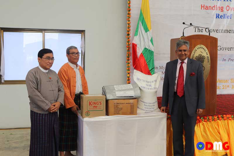 Arakan State Hluttaw Speaker U Kyaw San Hla requested the Indian government’s donation, which included 20,000 sacks of rice, peanut oil, rice vermicelli, Toor Dal, Chana Dal, pepper, turmeric powder, coriander powder and salt, as well as tarpaulin.