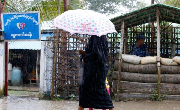 Rohingya woman and her child walk pass the police outpost at the Shwe Zar village in Maungdaw township, Rakhine State, western Myanmar. Photo: Nyein...