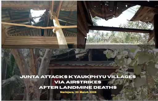 Khaing Lu Hla (Roma Mray) — Myanmar military junta forces launched aerial bombardments on villages in Kyaukphyu Township, Rakhine State, on 18 March 2026, following the deaths of at least 10 soldiers in a landmine attack.