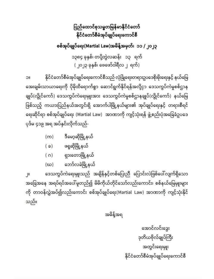 The Military Council declared martial law in 4 townships in Karenni State, 11 townships in Sagaing Division, 8 townships in Chin State, 5 townships in Bago Division, and 5 townships in Magway Division.