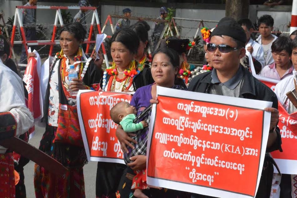 The protesters held banners urging the Kachin Independence Organisation/Kachin Independence Army (KIO/KIA) to immediately halt its offensives against local militias and to sign the nationwide ceasefire agreement (NCA). The protesters also voiced support for the Burma Army policy of clearing people from land in northern Burma.