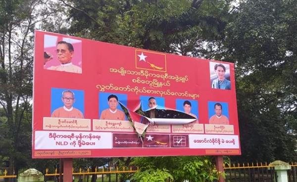 Saung Zarchi — At least two election-banners, erected in support of National League for Democracy (NLD) candidates, were destroyed in downtown Sittwe...