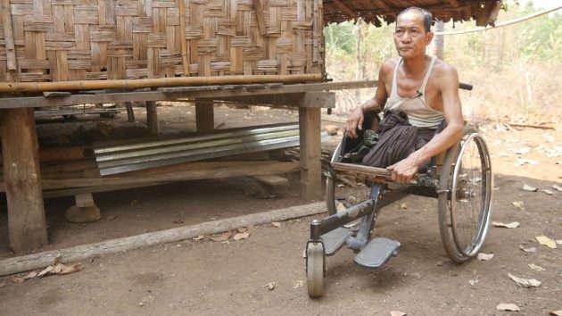 Kyar Yin’s brother Kyar Khin was in the jungle with his wife collecting bamboo when he stepped on a mine. He lost both his legs.