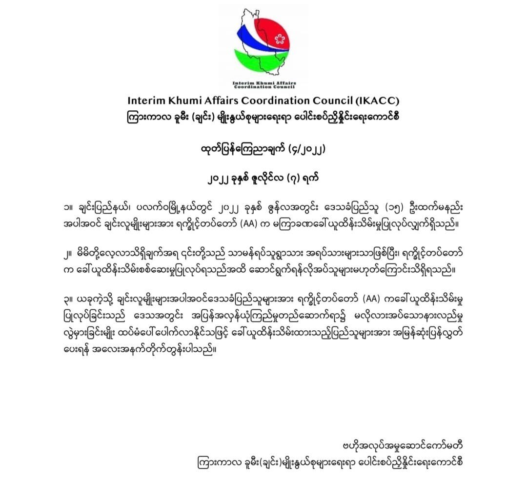 “I don’t know exactly why AA has arrested these people…What I can say is that they’re ordinary villagers” and not soldiers, an official from the Interim Khumi Affairs Coordination Council (IKAAC) told Khonumthung News.