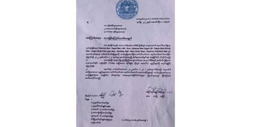 The KIA sent the letter to grocery stores, restaurants, KTV establishments and bars telling them not to sell and transport military-backed products such as Myanmar beer, Dagon beer, ABC Beer, Andaman beer, Dagon Gin, Dagon Extra Strong Beer, Dagon Single Malt Larger Beer, Mandalay Beer, Black Shield Stout, Myanmar Premium Beer and Sin Min cements.