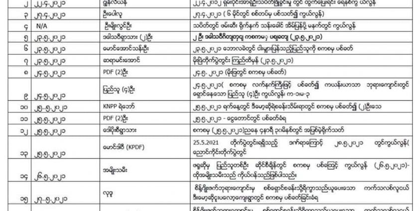 According to KNDF, Burma Army killed 31 people in Karenni (aka Kayan) State between March 19 and May 31.