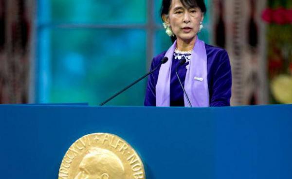 Nobel peace prize laureate, Myanmar opposition leader Aung San Suu Kyi gives her Nobel lecture in Oslo. Photo: AFP Myanmar democracy activists...