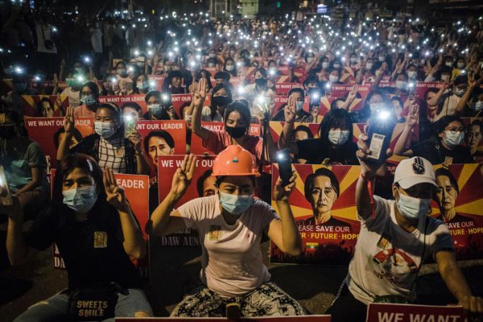 Protesters hold up the three finger salute and placards with the image of detained Myanmar civilian leader Aung San Suu Kyi while using their mobile torches during a demonstration against the military coup in Yangon. Photo: AFP
