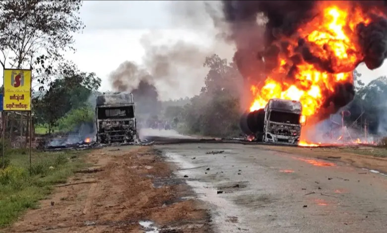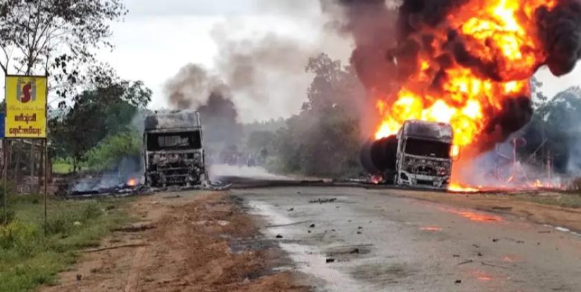 The 5:00 pm airstrike on the main road that connects Mandalay City, Myanmar’s second largest city, to Myitkyina City, the Kachin State capital to the north, injured four people, one of whom was a child and caused fires that destroyed two oil tankers and a roadside diner, according to local resistance forces.
