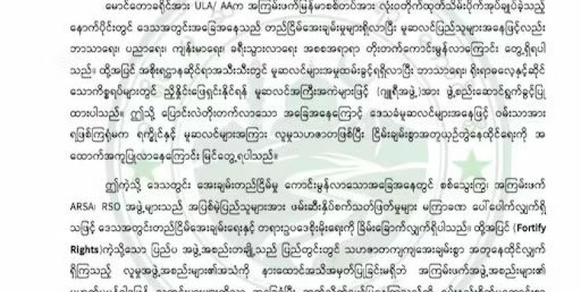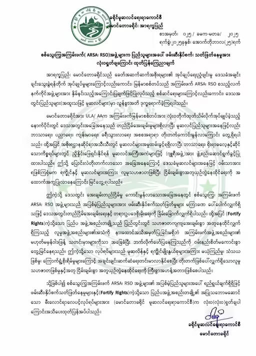 of improving peace and stability in the region, the militant and terrorist groups ARSA and RSO increasingly engage in the abduction, torture, and murder of innocent individuals, thereby jeopardizing regional peace and the rule of law. It is unfortunate that certain international organizations, such as Fortify Rights, fail to acknowledge or hear the perspectives of the communities that live together in harmony and peace within the nation. Rather, they convey distorted information that stems from the misleading propaganda of terrorist groups," the statement indicated.