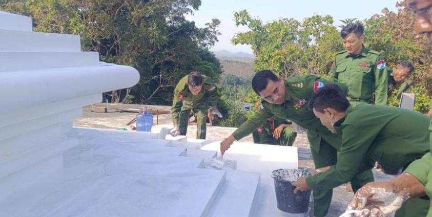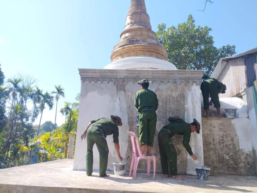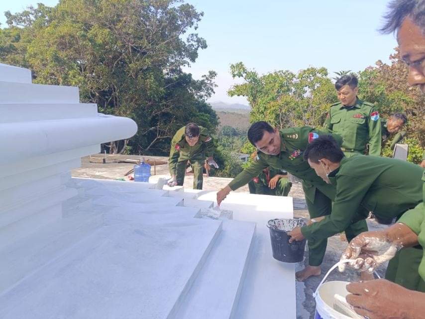 The military council’s propaganda newspaper stated that staff and soldiers cleared the bushes and painted the stupas in pagodas and monasteries in Mandalay, Magway, Sagaing, Bago, and Tanintharyi Regions, including Kachin, Kayah, Chin, Shan and Rakhine States.