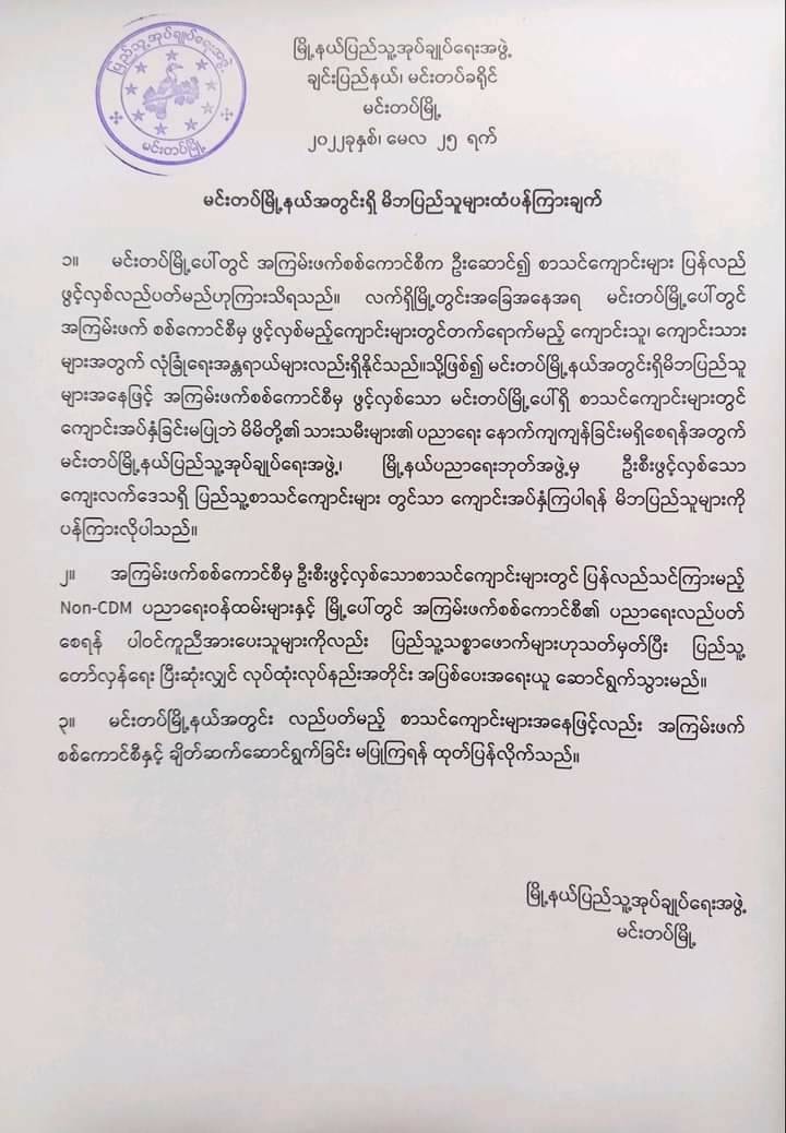 “We will take action against teachers and other education employees who do not join the civil disobedience movement after the people’s revolution is over, because these people are helping the military regime,” said the Mindat People’s Administration in its recent statement.