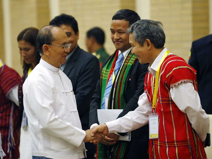 Myanmar president Thein Sein (L) shakes hand with a member of the Karen delegation (R) before a meeting with ethnic armed groups leaders to discuss the signing of a Nationwide Ceasefire Agreement (NCA) at the Myanmar International Convention Center (MICC) in the capital Naypyitaw, Myanmar, 9 September 2015. Photo: Lynn Bo BO/EPA