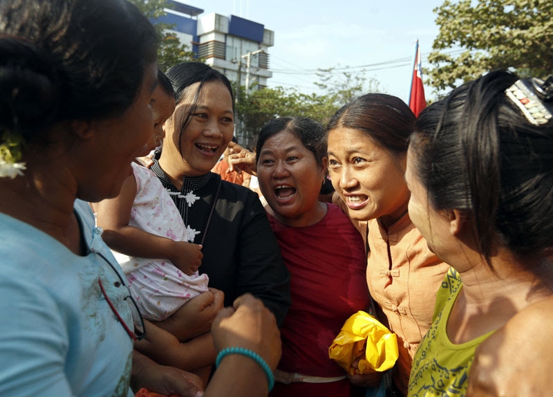 Political activist Naw Ohn Hla (C) is reunited with her friends after her release from Insein prison in Yangon, Myanmar, 17 April 2016. Photo: Nyein Chan Naing/EPA