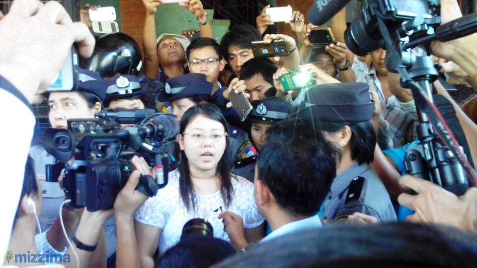 Chaw Sandi Tun speaks to media outside Maubin township court after being sentenced to six months in jail on 28 December 2015. Photo: Yin Mon Khing/Mizzima