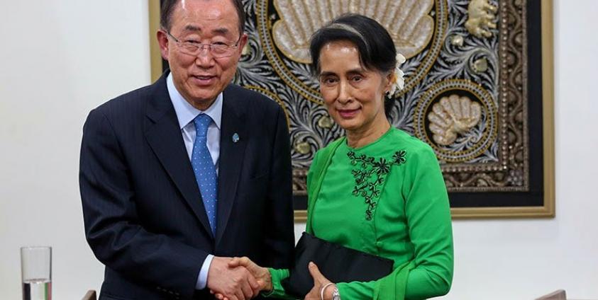 United Nations Secretary-General Mr Ban Ki-Moon during his working visit to Myanmar paid a courtesy call on Daw Aung San Suu Kyi, the State Counsellor and the Minister for Foreign Affairs yesterday evening at the Ministry of Foreign Affairs.