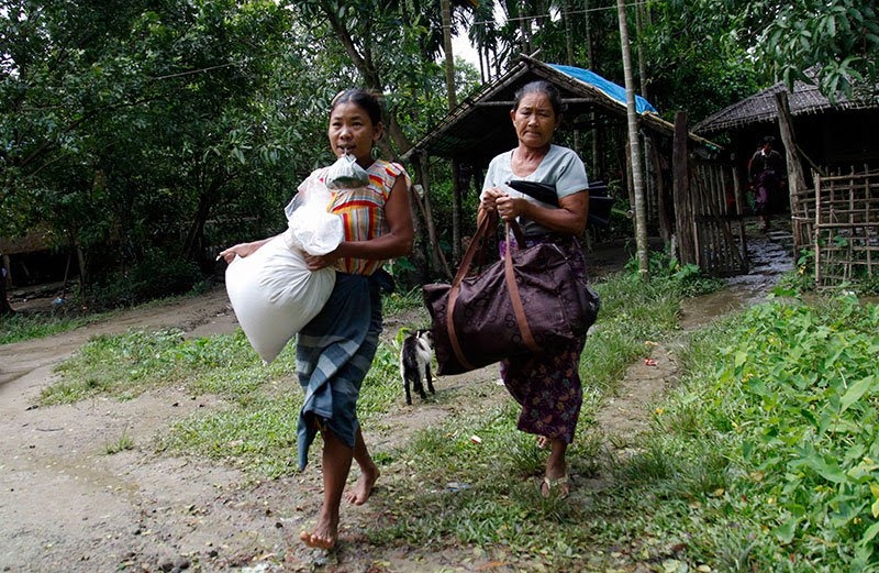 Villagers carry belongings as they prepare to flee from fighting at Aung Mingalar village near Maungdaw town of Bangladesh-Myanmar border, Rakhine State, western Myanmar, 13 October 2016. Photo: Nyunt Win/EPA