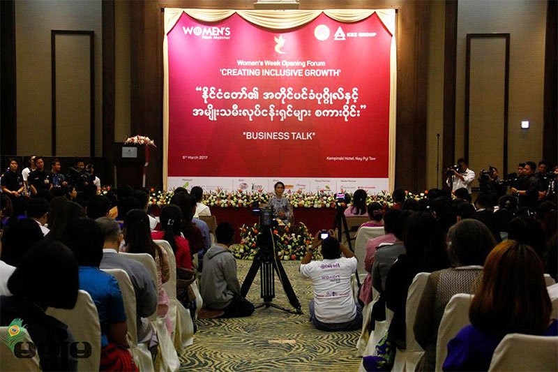 On the first day of ‘Women’s Week-Myanmar’ jointly organized by Ministry of Social Welfare, Relief and Resettlement, Yangon Region Government and Kanbawza Business Group, a ‘Creating Inclusive Growth’ Forum was held at Kempinski Hotel owned by Kanbawza Business Group and was attended by State Counsellor Aung San Suu Kyi who delivered the opening address.