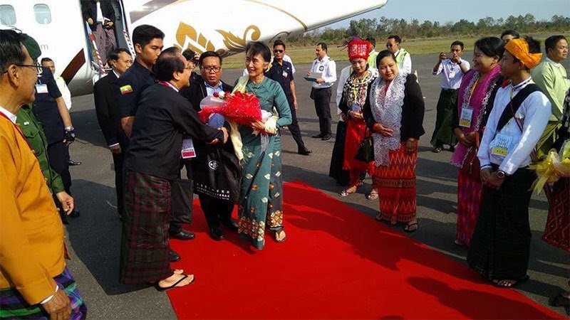Myanmar State Counsellor Daw Aung San Suu Kyi arrives at Myitkyina airport in Kachin State on 28 March 2017. Photo: Min Min/Mizzima