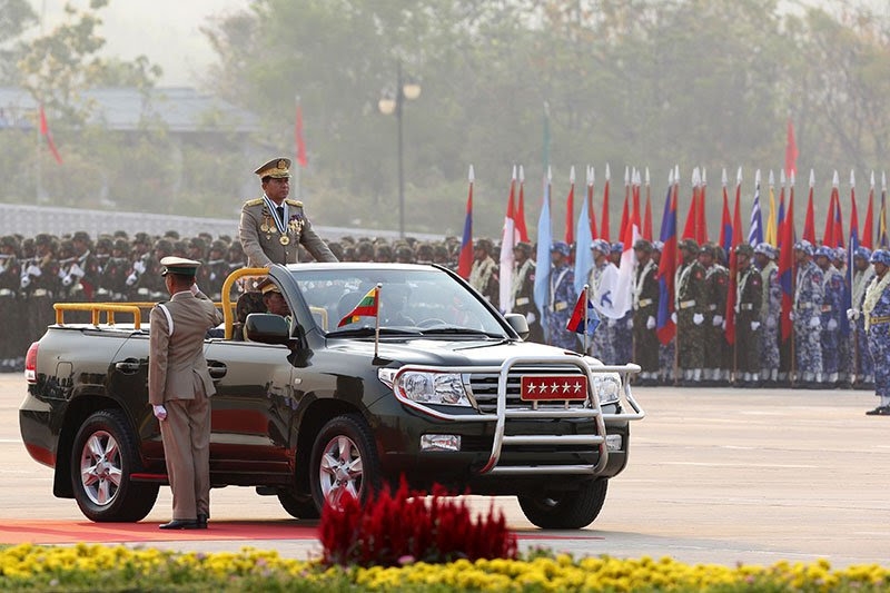 Myanmar Senior General Min Aung Hlaing inspects troops during a parade commemorating the 72nd Armed Forces Day in Naypyitaw, Myanmar, 27 March 2017. Photo: Hein Htet/EPA