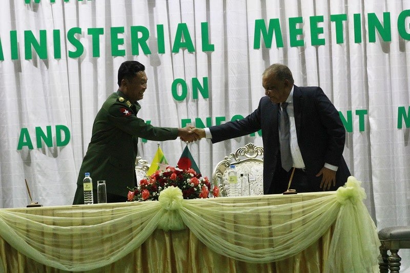 Minister of Home Affairs for the government of Bangladesh Asaduzzaman Khan (R), shakes hands with Myanmar's Home Affairs Minister Lt.Gen Kyaw Swe (L), during a meeting on security and law enforcement matters, at Ministry of Home Affairs in Nay Pyi Taw on 24 October 2017. Photo: Min Min/Mizzima