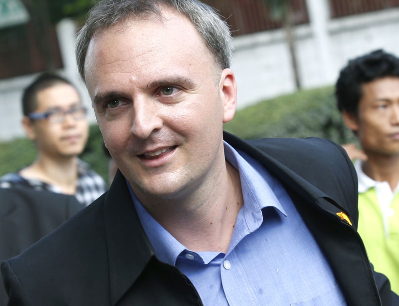 British rights activist for migrant workers, Andy Hall (C) arrives for his trial at the Phra Khanong Provincial Court in Bangkok, Thailand, 29 October 2014. Photo: Narong Sangnak/EPA