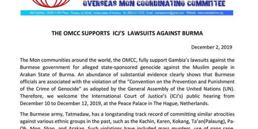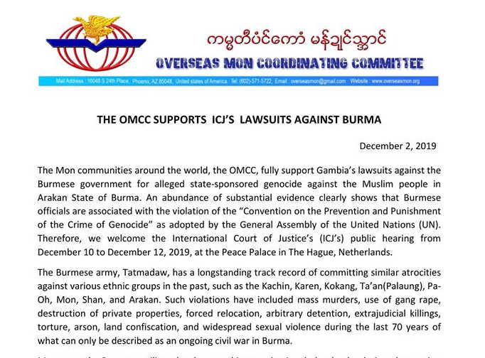 Organizations representing the ethnic Mon community abroad have come out in support of Gambia’s prosecution of the Burmese state in the International Court of Justice (ICJ).