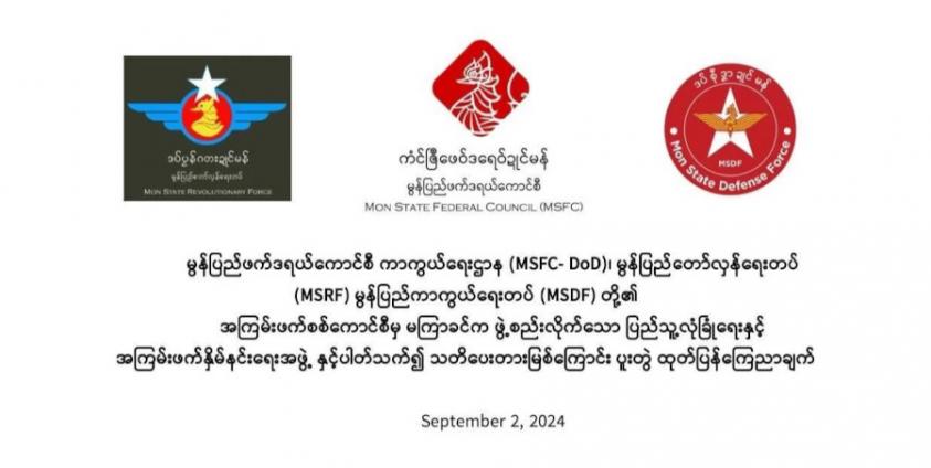 The 2 September 2024 joint statement was issued by The Mon State Federal Council's Department of Defense (MSFC-DoD), the Mon State Revolutionary Force (MSRF), and the Mon State Defense Force (MSDF).
