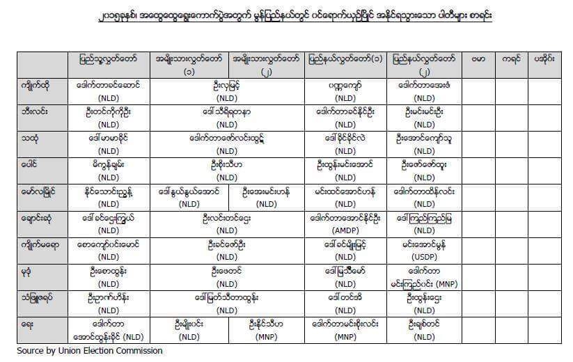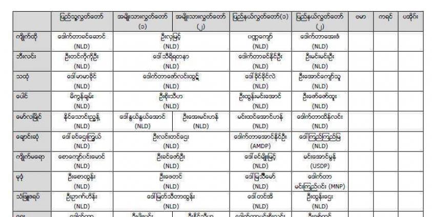 Three Mon parties had candidates running, they were: the Mon National Party (MNP), the All Mon Regions Democracy Party (AMDP) and the Women’s Party (Mon). Some Mon candidates had also ran as independent candidates after they split from their parties.