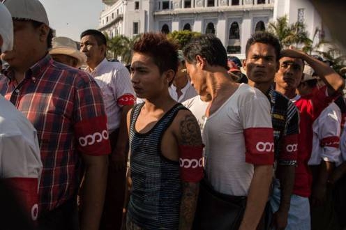 During the protest, a group of thugs known as Swan Ah Shin (Masters of Force), dressed in plain-clothes and bearing arm-bands with “Duty” written on them in Burmese, along with policemen, arrived to break up the protest and arrest a number of protesters.