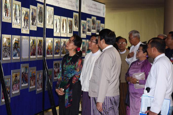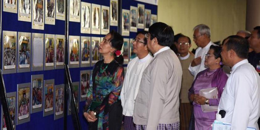 State Counsellor Daw Aung San Suu Kyi, former President U Htin Kyaw and wife, and dignitaries looking at documentary photos on activities of community centres displayed at the ceremony to hand over mobile libraries of Daw Khin Kyi Foundation to Ministry of Information in Nay Pyi Taw yesterday. Photo: MNA