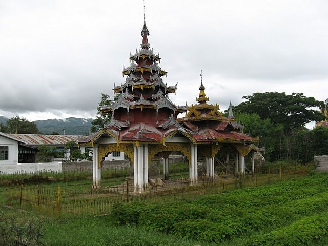 I cannot help but tell you about Paung Daw Oo, the Pagoda of true and devoted believers, far and wide. Every year about October, the festival begins with the tour of the images along the shore of Inlay Lake, on an impressive barge, decorated with the motif of Karaweik, a legendary bird featured in pageantry. The majestic barge is then pulled by the famous leg rowers on tandem racing boats each of which carried thirty or more of these powerful men whose muscled legs strained in unison as they impelled the oars. After the rounds of villages, the images safely returned to their resident village. It wasn’t so on one occasion in the mist of time as legend would have it, when a great storm sank the barge which with the images went to the bottom. Though they searched for days, no images were found, but miraculously they were seen to have returned, some images with sea plants on them. With passing years this legend has spread, and devotees prize highly the yellow cloth from the images that can confirm protection and promote prosperity and good health.