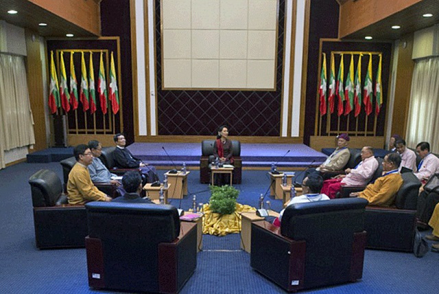 Myanmar’s State Counselor Aung San Suu Kyi (C) holds talks with leaders from the United Nationalities Federal Council at the National Reconciliation and Peace Center in Yangon, July 17, 2016. (Photo: RFA)