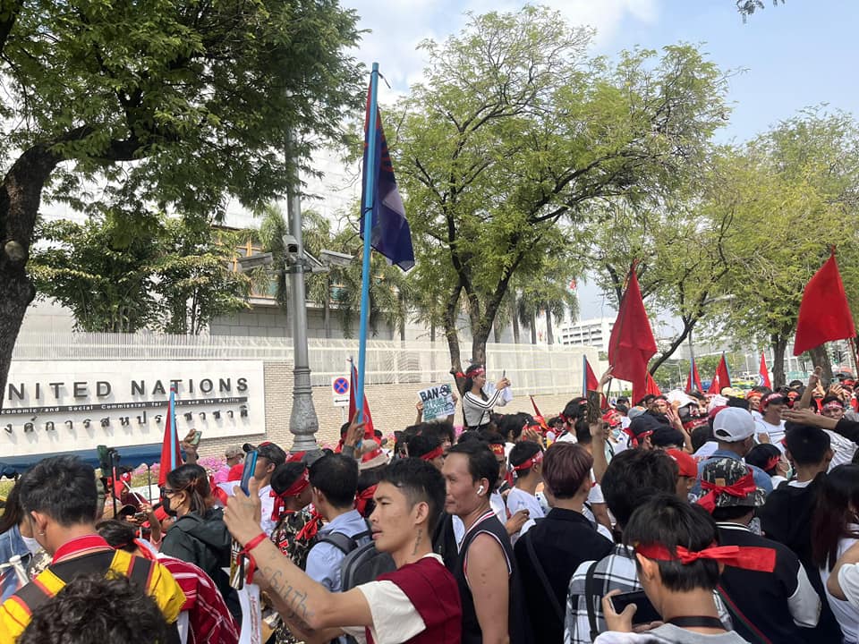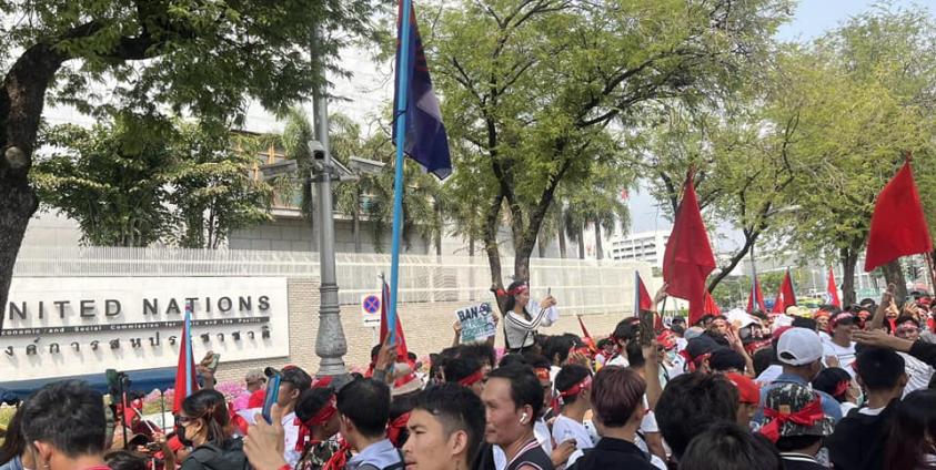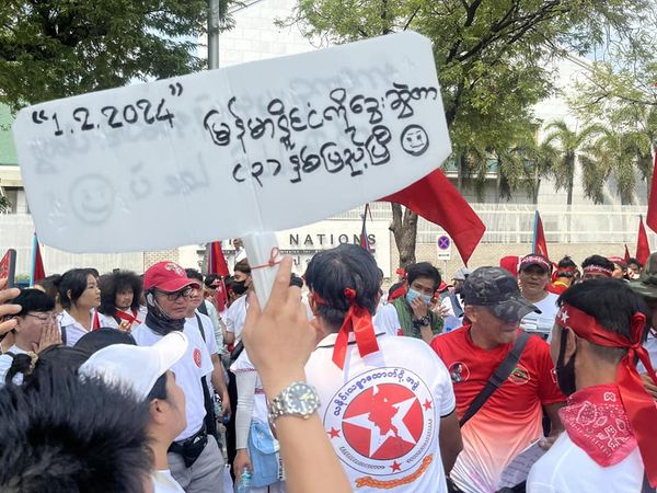 During the protest outside the United Nations (UN) office in Bangkok, Myanmar citizens residing in Thailand marched and displayed banners proclaiming, "Three years since the Mad Dogs hounds gnawed Myanmar".