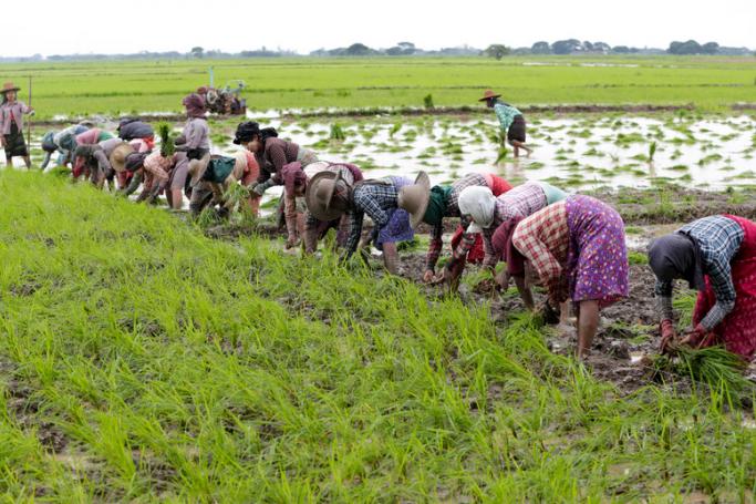 Myanmar women wearing hats and headscarfs line up as they plant paddy seedlings to grow rice crop at a farm in Ma-ubin township of Ayeyarwaddy region, Myanmar. Photo: Lynn Bo Bo/EPA