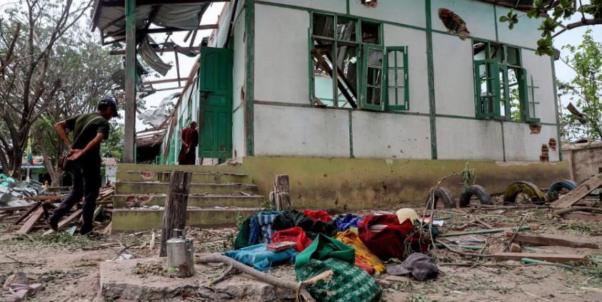 A video report by The Irrawaddy captured the aftermath: bloodstains on floors, empty schoolbags, and white-and-green-painted classroom walls pockmarked with shrapnel damage. Torn zinc roofing sheets and collapsed beams littered the compound.