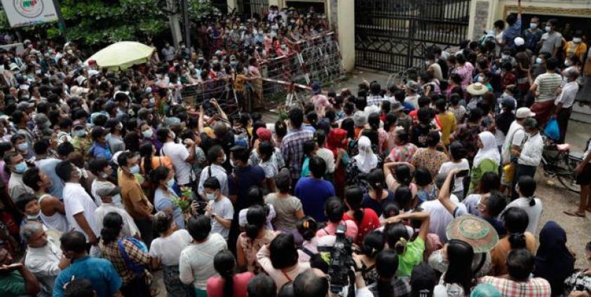 Photo: People wait behind barricades for their relatives to be released outside the main entrance of the Insein prison compound in Yangon, Myanmar, 30 June 2021. Photo: EPA