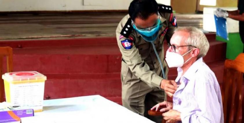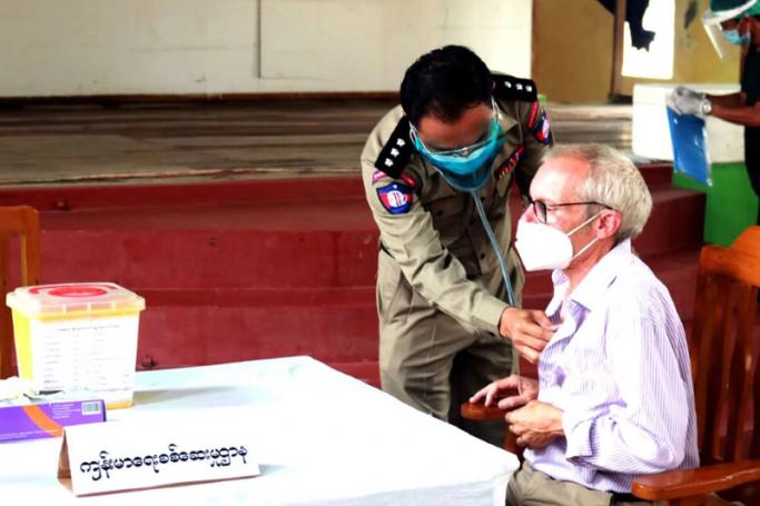 Sean Turnell, a detained Australian adviser to Myanmar's deposed leader Aung San Suu Kyi, gets vaccinated against the Covid-19 coronavirus in Insein prison in Yangon. Photo: APF