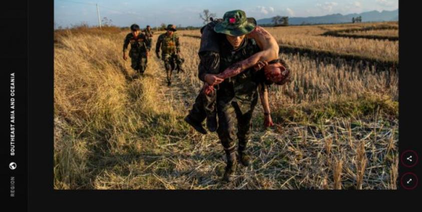 The caption for the photo reads: Resistance fighters from the People's Defense Forces retreat with the body of a comrade, following a clash with the Myanmar military, in Moe Bye, Kayah (Karenni) State, Myanmar. Myanmar authorities had sent reinforcements to the region as fighting with local opposition groups intensified.
